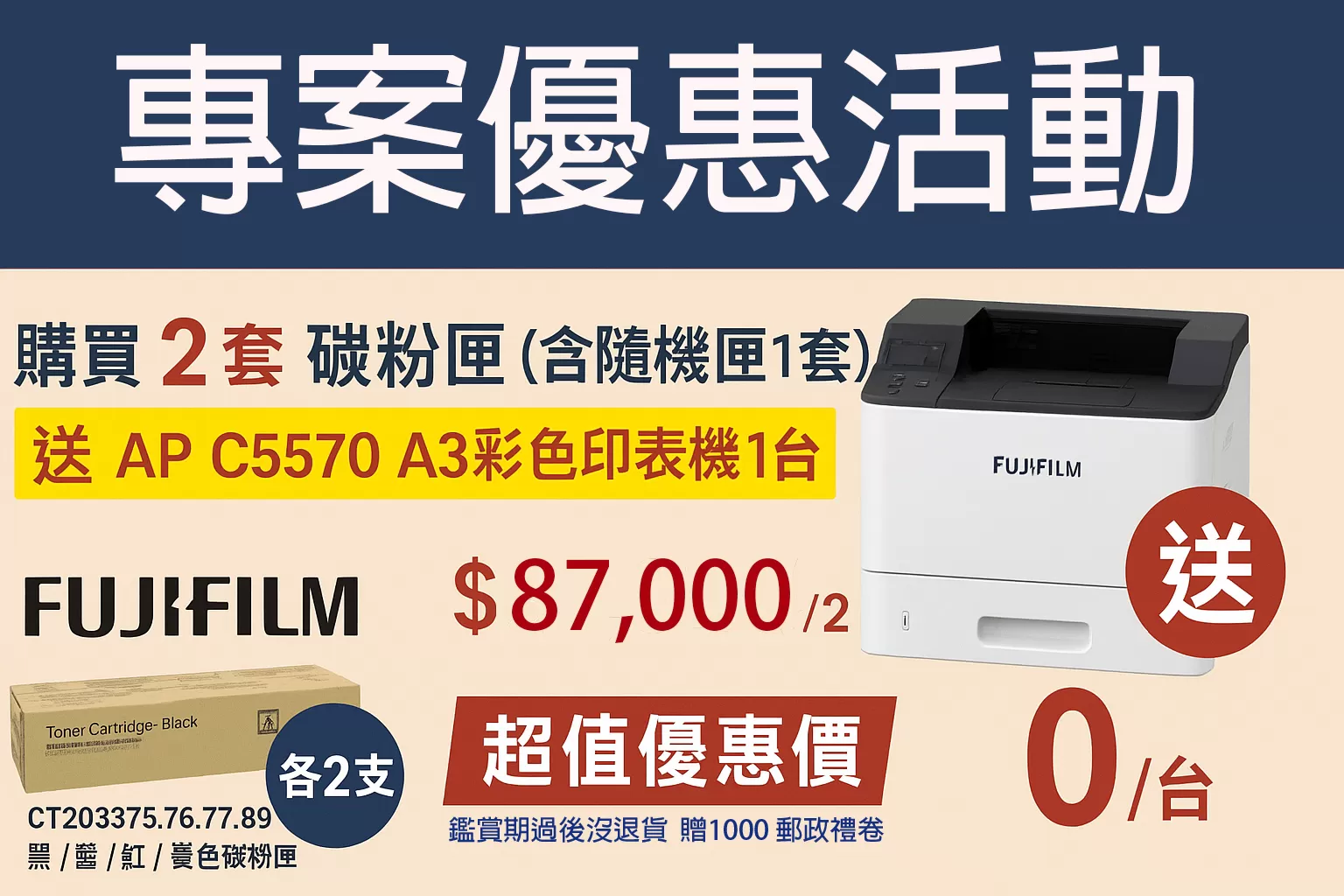 購買 2套碳粉匣(含隨機匣1套) 送 APC5570 A3彩色印表機1台