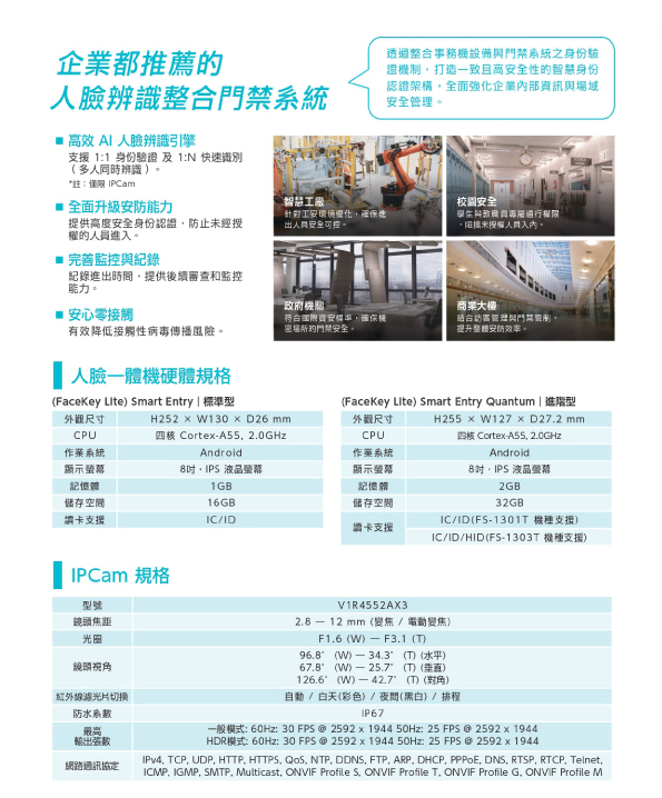 採用 FaceKey 技術,辨識速度快達 0.2 秒。即便在配戴口罩、眼鏡或帽子的情況下,依然能精準判別身份,甚至支援多人同時辨識,大幅提升出入口的通行效率。