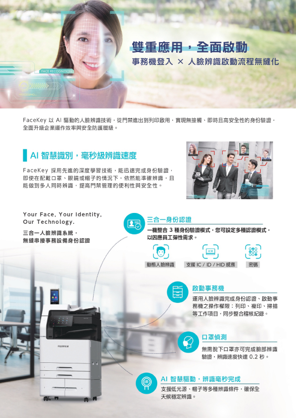 富士軟片 推出的人臉辨識設備整合解決方案,結合了先進的 AI 深度學習技術與硬體整合,將傳統的辦公設備升級為智慧安防門戶,為企業提供更便捷、更安全的管理體驗。
