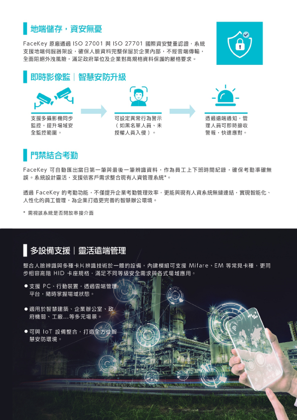 FaceKey 系統通過 ISO27001 與 ISO27701 國際資安認證,並支援「地端伺服器」架設。所有個人臉部資料均保留在企業內部,不經雲端傳輸,免除資訊外洩疑慮,符合政府與高科技產業嚴格的資安標準。